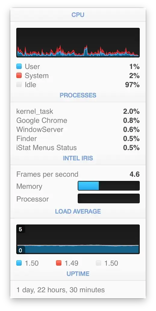 1The app's UI in the menu bar is fantastic. One nit though is that it is showing somewhat different utilization % compared to the Activity Monitor, plus the most CPU consuming processes are different in Stats and Activity Monitory. – Bananeen Sep 08 '22 at 18:23
