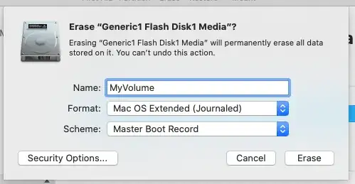 If the volume on the USB flash drive is no longer labeled MyVolume, then use the Disk Utility to erase the flash drive. Highlight the flash drive, then click on the Erase button. Use the setting shown in the image below.