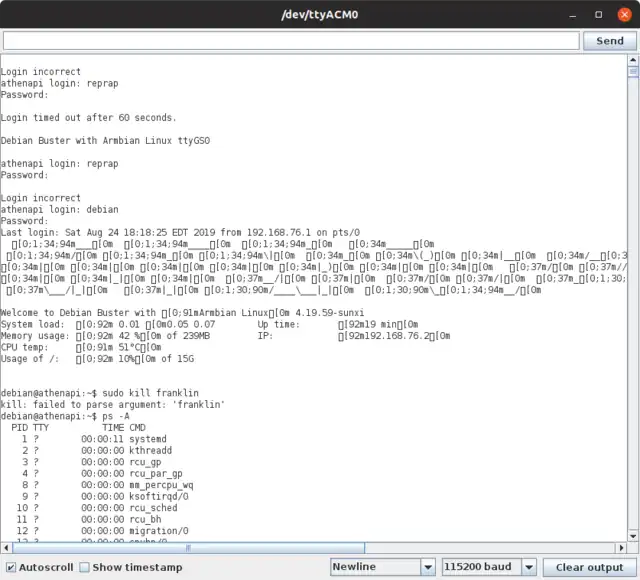 To be able to see Franklin process responses during printing you can SSH to the Orange Pi board via Ethernet or via serial monitor: