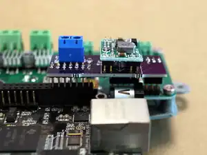 - Note how pins line up between bridge board, Melzi and Beaglebone.Align the bridge board with the Melzi and Beaglebone so that the double row of female headers engage the male pin headers on the Melzi and the single row female pin header aligns with the matching male pin header on the Beaglebone. The remaining double row of male pin headers should then align with the end of the long double row female pin header on the Beaglebone. Once all of the pins are aligned, carefully and fully engage all the headers. Tighten the loose screws on the Melzi.Properly placed bridge board.