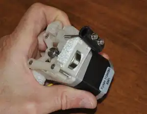 An extruder consists of two ends - a hot end and a cold end. This portion of assembly covers construction of the cold end, or extruder drive, the part of the system that pushes the filament into the hot end. The extruder drive is a pinch-wheel design wherein filament is pinched between a preloaded idler bearing and a toothed drive gear. Filament is pushed hard against the drive gear by the preloaded idler so that the teeth in the drive gear engage the filament, forming something akin a rack-and-pinion drive. The stepper motor then pushes the filament into a Bowden cable, where the filament is constrained and can only exit through the nozzle in the hot end.