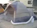 - I learned quickly that this little system was no match for the hot sun on this large of a tent. I even had a little bit of a shade structure over my tent. So what I did was safety pin some cord to the tent a couple feet high across the top of my bed, then draped my sheet over the cord. This created a little kid style fort over my bed. I cut up some cardboard and made a few baffles to direct the cool air from the Cooler into the little fort. This turned out to be perfect. It was 95-°F outside and I could sleep like a baby.