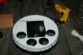 - Drill four small holes equally spaced around the perimeter of one side of the adapter near the edge. The holes should be slightly larger than the quick ties that will be used to secure the adapter to the lid. Drill four holes near the edge of the hold cut out of the lid. These holes should line up with the holes in the adapter. Secure the female/female adapter to the lid with quick ties through the holes.