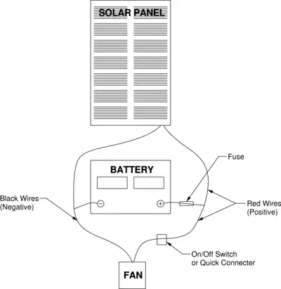 - Note: When you turn the fan off and on, you want to leave the solar panel connected to the battery to allow charging of the battery.