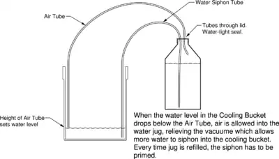 - I would make the air tube in the siphoning system a larger diameter. Sometimes, if the water jug was too high, the siphon pressure would suck water up the air tube so high that when the water level in the cooling bucket dropped the air tube wouldn't drain, rendering the self leveling system useless. Specifically, I would solve this by stepping up the size of the tubing using either an adapter or just shoving the small tube into the opening of larger tube. For example if the siphon tube was 3/8" O.D (Outside Diameter), you could shove it into a tube that had 3/8 I.D. (Internal Diameter). I would step up a couple times to at least 5/8" I.D. Also the 5/8" I.D. tubing should extend up about as high as you plan for the top of the water jug. That large of diameter tube will eliminate the capillary effect that happens in narrow I.D. tubes and will allow whatever water that might have sucked up the air tube to drain once the water level in the cooling bucket drops below the opening of the air tube.