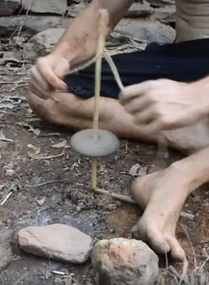 Project developed by Cascheel. Here is a Link to a Primitive Technology YouTube video that shows the original design working and some other uses for the tool. The basic consept is that the fly wheel gets compression fitted on the straight-ish stick and the rope is attached to both ends of the pump with the middle of the rope also attached to the end of the stick. the pump gets pushed down and the momentum of the spinning stick re-wraps the rope around the stick for the next pump.