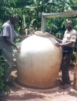 Rakai is in the southern hills of Uganda. It has a bimodal rainfall pattern and hence a dry season of only 2 months. A local women's group was trained in tank making by a Kenyan women's group and have made a large number of small (700 litre) jars to supplement their water use, particularly in the wet season when they provide the bulk of water needs. The sub $70 cost of the systems are financed by a self sustaining revolving fund.