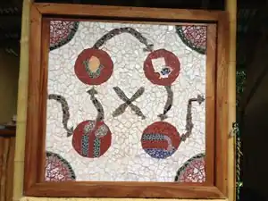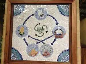 | This closed loop artwork created by Maudie Johnson displays a representation of the biodigester toilet system. Explanation from left clockwise: Food is eaten and turned into poop. Poop is flushed into the biodigester, where it is processed into compost and fuel. The compost grows more food, and the fuel cooks the food before it is eaten, continuing the cycle. |