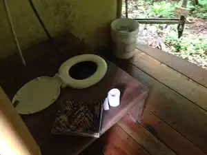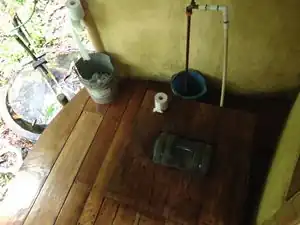 | The other toilet is a sitting toilet for "conventional" pooping. It is flushed by turning on the water to a hose that is inserted inside the toilet bowl. | |