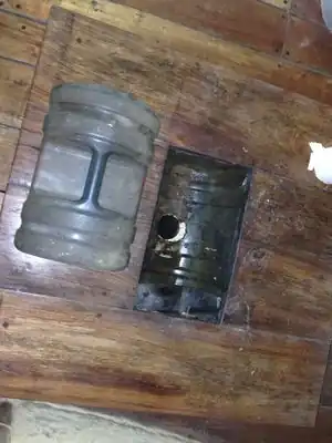 One of the toilets is a squating toilet. Squatting to defecate is less strenuous on the body. The squatting toilet was made by cutting a 5 gallon water jug in half length-wise and using one half for the toilet basin, and the other half for the lid. The toilet is flushed by filling a bucket with water and manually pouring the water in the toilet basin. |