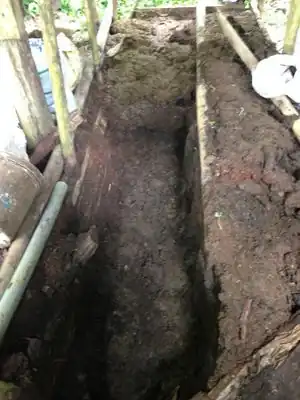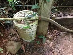 | Methane is collected from the anaerobic digestion and piped to the kitchen. This is a bucket between the biodigester and the kitchen used to catch liquid particles that make it through the pipe. | |