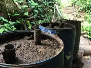 The manure biodigester at Rancho Mastatal converts animal waste into fertilizer and cooking fuel. It also provides extra waste material to the nearby floating drum biodigester toilets if the biodigester toilet use is not frequent enough to keep the drum functioning.