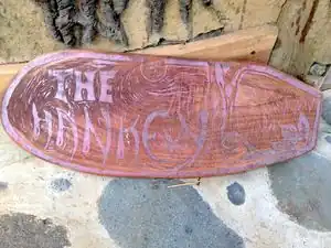 Broken tile sink.- Bamboo walls and roof and timber branch supports.