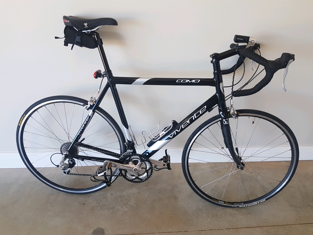 Looks like a Vivente Como road bike circa 2007-2010 (judging by discussion forum posts and ad listings), converted to flat bars and some stickers/paint removed from frame. The crankset looks like FC-3550, which might be aftermarket too, since it seems to have been released somewhere 2013, several years after Como estimated production years (or maybe bike shop sold an old frame like that, who knows). Vivente website does not list this bike as a previous model, but then again the list goes from 2018 to 2012. If you Google for images, there are bikes called "Vivente Como" with partially matching paint job (see bottom tube), fork and logo on it and RD hanger.