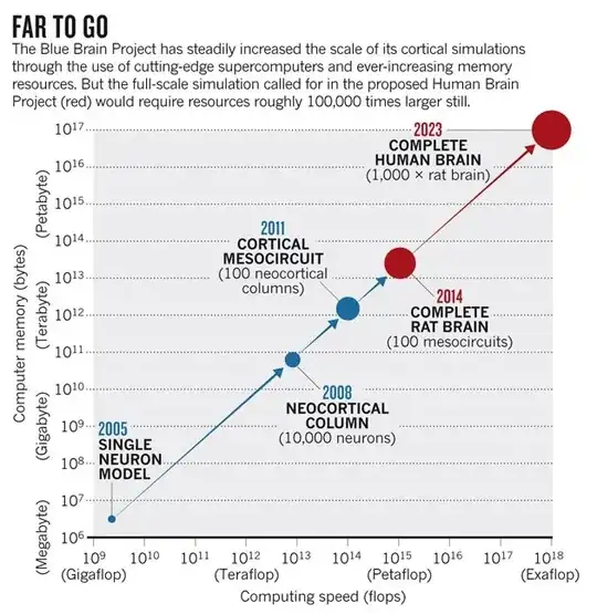 There's a very big difference between doing the calculations needed to simulate the human brain (or any animal brain - we can do a fairly decent job on C. elegans), and doing computations. While a basic leaky integrate & fire model is fairly simple, to accurately simulate a single neuron in real time takes a pretty fast computer. See e.g. these links for more, http://www.neuron.yale.edu/neuron/, http://bluebrain.epfl.ch/ http://www.artificialbrains.com/darpa-synapse-program.