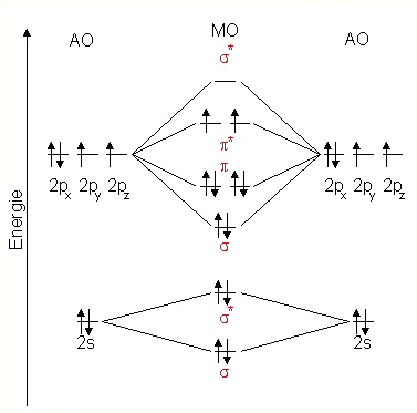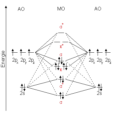 The lighter second period elements (prior to oxygen) have a relatively small difference in energy between the 2s and 2p orbitals. This allows sufficient s-p mixing to lower the energy of the σ(2s) and σ*(2s) molecular orbitals, and is energetically offset by an increase in energy of the σ(2p) and σ*(2p) molecular orbitals. In the dinitrogen molecular orbital scheme, the dashed lines are there to represent s-p mixing influencing the energy of the four molecular orbitals involved.