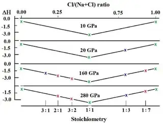 For example, $\ce{NaCl7, NaCl3, Na3Cl2}$, and $\ce{Na2Cl}$ are metals (that explains the apparent violation of electroneutrality since charge balance rules are inapplicable to metals), and only one semiconducting phase of $\ce{NaCl3}$ is stable in the pressure range between 250 and 480 thousand atmospheres.