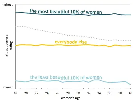 I'm particularly doubtful of this second graph though, because it doesn't seem clear that the top and bottom deciles were identified and excluded separately within each year of age. "If you separate out the absolute best-looking women, almost all of whom are very young" actually sounds more like excluding the top decile while ignoring age, which might invalidate this graph. Removing the most extreme deciles of the sample while ignoring age would necessarily flatten the "everybody else" line somewhat, given any asymmetry in relationships between age and membership in these deciles of attractiveness across all ages.
