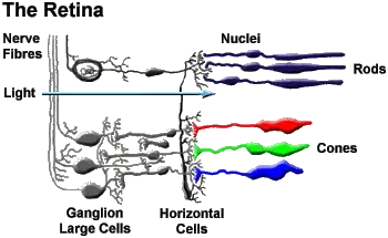 Note the single ganglion cell connected to all three rods, and the three separate cells for each cone.