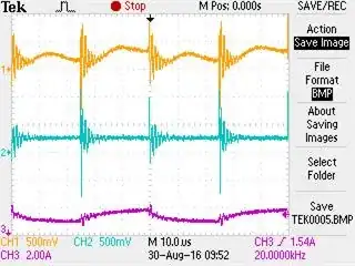 The channel 3 is is the input current I measure by the current oscilloscope probe. The channel 1 and the channel 2 refers the same port, port"1". However, the channel 1 used the ground antenna, while the channel 2 did not. We can see that some ripples are reduced, but not all of them.