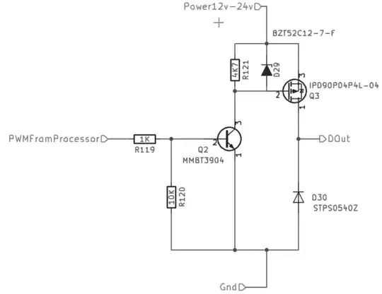 EDIT: I've revised the circuit. The PWM will be no more than 1khz. D29 has now been changed to 12v to protect the fet. D30 is simply a freewheeling diode. R120 is there to pull to ground for when the controller is booting. I lowered R121 to 4.7K from 10K to increase the allowable PWM speed. All good now?