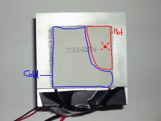 I wired it to a 12 volts DC, 8-amp power supply, and connected the hot side to a fan & heatsink with thermal grease. Turning it on, I noticed that condensation forms on about 70% of the cold side, but the rest is dry. Most of the cold side feels really cold, but one spot in the dry corner is too hot to touch! An infrared thermometer says the coldest corner (near the negative input wire) is about 2.5°C (36°F), and the hot corner diagonally opposite it (but still on the cold side) averages 46°C (115°F).