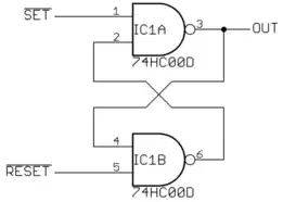 I am looking for a device or circuit that outputs HIGH when a pushbutton has been pressed (if the button is pressed again it is supposed to still output HIGH), also, if possible, another pushbutton to make the output LOW.