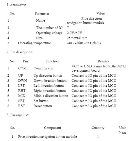 I have a joystick that I wish to connect to my Arduino uno. However, there's no VCC or 5V or GND pins to connect to. I do see a COM pin, but I'm unsure how I should wire that to the Arduino. My objective is to take an input that determines whether LEDs should be emitting light or not.