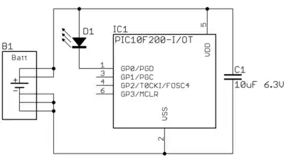 The single resistor in the schematic sets the LED drive current, between 1 mA and 20 mA. It itself does not carry significant current (less than 1 μA), so will not drain the battery noticeably.