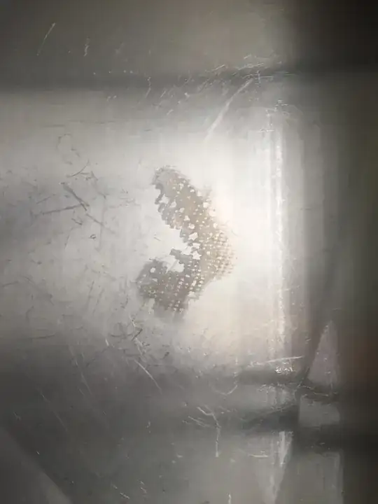 Repeating some of what has been said[ mechanical polishing. Go to an auto store and get 600 grit Wet or Dry silicon carbide paper . If that does not remove it ,try 400 grit and follow with 600. You will not get a perfect match. There are other grits like 320,800 and 1000 ,but I am guessing 400 and 600 will give a reasonable match. I cleaned the interior of my dishwasher this way ,it looked pretty good . I have removed marks from SS refrigerator and stove , each maker seems to have their own finish. SS comes from the mill with certain specified finishes but apparently manufacturers will do some refinishing after the form/bend the SS.