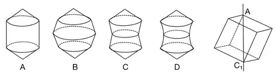 The central portions are hyperboloids of 1 sheet capped by two cones at the ends. ( not catenoids). The hyperboloid of one sheet is a ruled surface formed by rotation of a skew line about the rotational axis of symmetry.(Examples are cooling towers, hypoid gears etc).