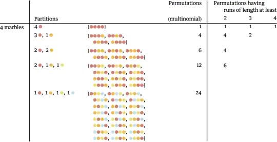 We observe that these three coefficients correspond to the configurations $(2,2), (2,1,1)$ and $(1,1,1,1)$ of marbles and derive in accordance with OPs example in the column runs of length at least 2: