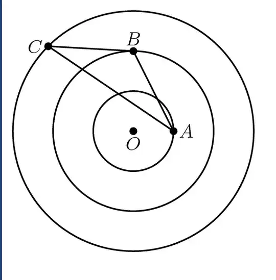 Assume uniform distribution for the point on each circle. We can fix one of the points because area is rotationally invariant. Fix the inner most point to be $(1,0)$.