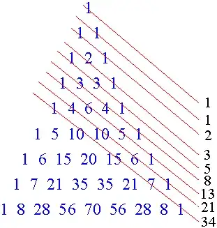 This image is quite self explainatory, the Fibonacci numbers are sum of shallow diagonals of Pascal triangle. We represent it mathematically as $F_n={\sum_{k=0}^{[\frac{n}{2}]}}$ ${n-k+1}\choose{k}$ where $[ \ ]$ is floor function.