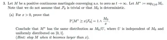 This was an old homework question for an exam I'm studying for. I have the answer but can't understand it. I've followed the hint but I cannot get the third term in the conditional expectation given below: x * indicator of M0 > x. Where does this come from? Surely there are only 3 possibilities, Hx = 0, 0 < Hx < t and Hx > t. I'm so lost.