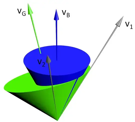 The above computation can easily be adapted to a cone in general position, though I’m not sure that it’s worth the extra complexity: The planes $\mathbf\Pi_+$ and $\mathbf\Pi_-$ just need to use $\tilde{\mathbf V}_B$, normalized, instead of $[0,0,1]^T$, but you’ll still have to implicitly translate the apex to the origin to compute the rotation axes, and both $\mathscr H$ and the boost back to 3-D will involve a rotation. It seems much easier to me to transform $\mathbf V_1$ and $\mathbf V_2$ and then transform back once you’ve found the new rotation axis.