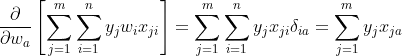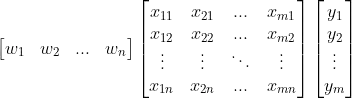 $= y_1(\sum_{i=1}^{n}w_ix_{1i}) + y_2(\sum_{i=1}^{n}w_ix_{2i}) + ... + y_m(\sum_{i=1}^{n}w_ix_{mi})$ $= \sum_{j=1}^{m}\sum_{i=1}^{n} y_jw_ix_{ji}$