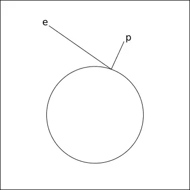 I have two points ($e$ and $p$) in a 2D space and I am trying to figure out where on the circle is the reflection of $p$ as seen from $e$.