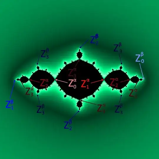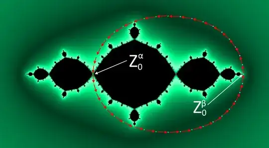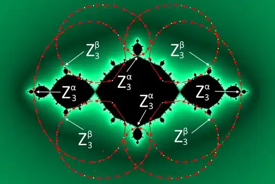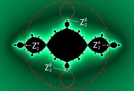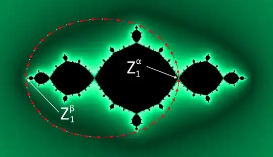 When this function is traced out, it creates the exact same shape as the fixed points themselves, only translated left, swapping between the first "pinch" point to the right of the main basin ($Z_1^\alpha$) and the far left limit point on the real axis ($Z_1^\beta$, far left).