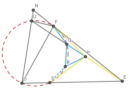 • I think, at the end, it should be $$\angle UFO = \angle USO = 180^\circ - \angle SOU -\angle OUS,,$$ but $$\angle OUS=\angle OUE-\angle SUQ$$ and $$\angle SUQ=180^\circ-\angle SRQ=180^\circ-140^\circ=40^\circ,,$$ whence $$\angle OUS=65^\circ-40^\circ=25^\circ,.$$ This means $$\angle UFO=180^\circ-80^\circ-25^\circ=75^\circ,.$$ – Batominovski Apr 21 '20 at 17:43