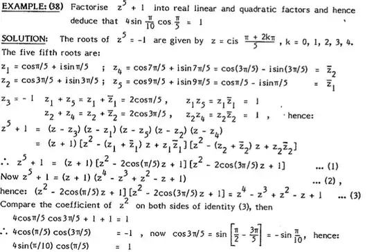 Factorising complex numbers how did he get from ....(1) to ....(2) how did he get factorisation $z^4-z^3+z^2-z+1$ from trig factorsiation