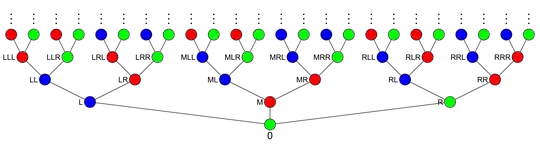 Your process can be thought of as a random walk on the letters $r, g$ and $b$. I will represent $R_{n}$ as a string such as $ggbbgb$. Denote $|R_n|$ as the number of symbols in such a string.