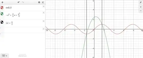 \end{bmatrix}$. But is it possible to find the volume of a solid that is rotated around a non-linear axis of rotation? For example, let's say that we are rotating the function $f(x) = -x^{2} + \frac{2}{\pi } x + \frac{\pi ^{2}}{4}$ around axis of rotation $g(x) = \sin (x)$. Notice that f(x) only intersects with g(x) at two points: $\left ( -\frac{\pi }{2},-1 \right )$ and $\left ( \frac{\pi }{2},1 \right )$. So we are only rotating f(x) around g(x) between those two intersections. I provide an image just to help with visualization. The red function is the axis of rotation, the green function is the function which we are rotating, and the black lines represent the bounds of rotation. My question is then, what is the volume of that solid of rotation? The only thing I found related to this was from this question,Solids of Revolution around other functions. , but the question was still left unanswered and this question is just a slight variant of that one.