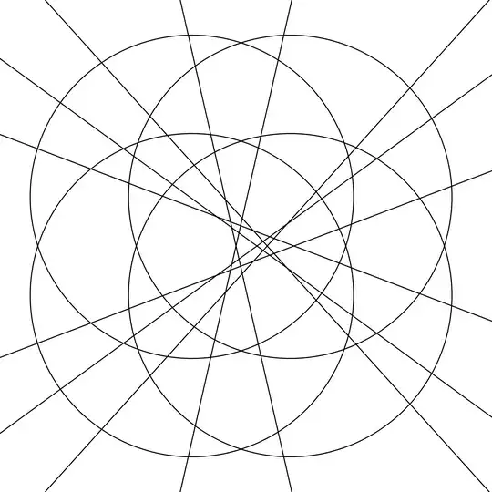 - Take a solution to the lazy caterer problem for the requisite number of lines – lines that all intersect each other – and scale the configuration down so that all intersections are inside the intersection of all circles. Generally, there is no multiple intersection, meaning that every line intersects every circle twice and we are finished. If there are multiple intersections, shifting the lines by a small amount (not enough to create multiple intersections elsewhere) suffices to remove the multiple intersection.