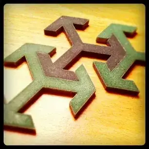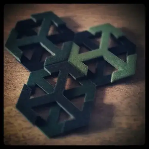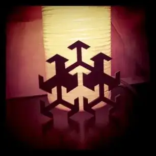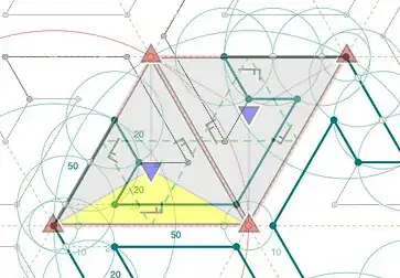 In addition to the p31m symmetry, there's an interesting relationship within the shape dimensions. The struts are of course all of equal width, and obviously all the angles are multiples of $60^\circ$. I've noted before, that the strut width is one quarter of the construction radius ( $w = \frac{r}{4}$ or as shown below, $2u$.) To calculate all required measurements we need to use the base unit $u = \frac{r}{8}$. The distance between the centres of each shape is $9u$. The length of a edge of the exterior arrow head (and of course it's corresponding interior edge) is $5u$. The remaining dimensions are the interior lengths of the arrow head, which are both $2u$ (of course, these interlock with each other.)