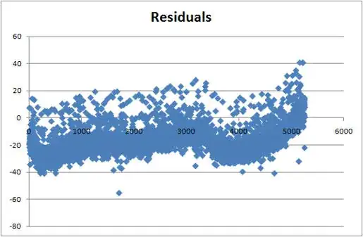 Here is the initial regression. The X axis is the elapsed time of the reference clock, in seconds. The Y axis is the difference between the elapsed time on the measured clock and the elapsed time on the reference clock, in microseconds (i.e. the error between the two clocks as a function of the elapsed time on the reference clock). The reference clock is precise, but not accurate, however I want to match any inaccuracy in the reference clock so that's okay.