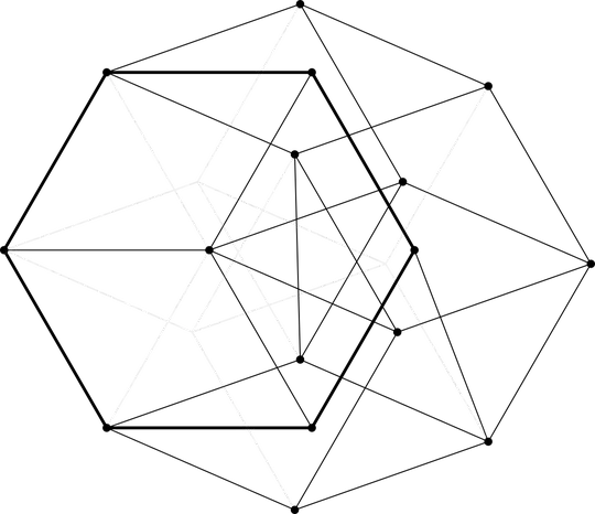 However, the above hexagon bracing is quite big. Another approach to triangle-free bracing is the virtual edge: in any embedding of the cubical graph with one edge removed, the distance between the two degree-$2$ vertices (incident to the missing edge) must always be $1$. This leads to the following triangle-free rigid regular hexagon in $16$ vertices and $29$ edges (Shibuya commit proof):