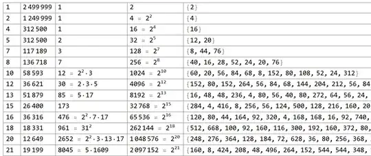 The leftmost column is $k$, the number of steps required to reach a smaller number. The fourth column, obviously going as $2^k$, is the period after which appearances of $k$ repeat. There are multiple appearances of a given $k$ within that period, e.g. for $k=5$ which shows up with alternating intervals of 12 and 20, but that's not required for my conjecture.