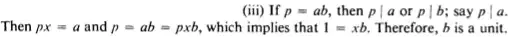 $(2)\ \ \ \color{#c00}{p=ab}\ \Rightarrow\ p\:|\:a\ \ {\rm or}\ \ p\:|\:b\quad$ [Definition of $\:p\:$ is irreducible, in associate form]