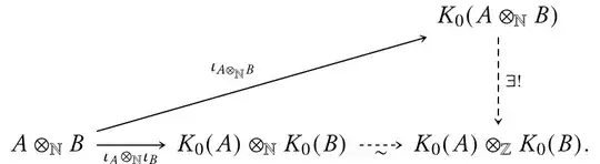 $\newcommand{\Q}{\mathbb{Q}}\newcommand{\N}{\mathbb{N}}\newcommand{\Z}{\mathbb{Z}}$Recall the definitions of the tensor product $\otimes_{\mathbb{N}}$ of commutative monoids (see also this note by Harold Simmons) and of the Grothendieck group $K_0$ of a commutative monoid (see also wikipedia). Given commutative monoids $A$ and $B$, we can apply the universal property of $K_0$ to the diagram